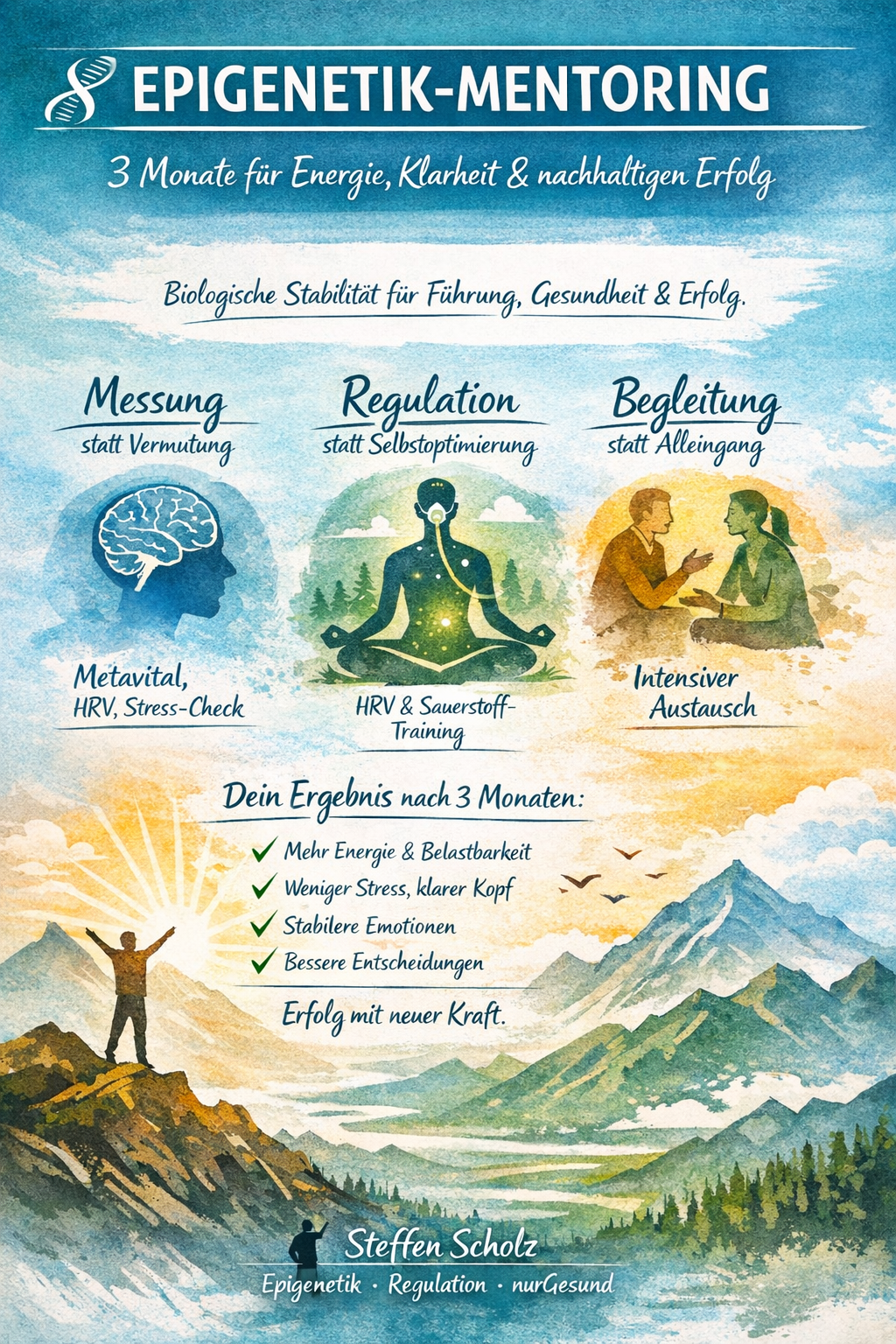 Dieses ermöglicht die Teilnahme am 3-monatigen Epigenetik-Mentoring gegen eine kleine Unkostenpauschale, verbunden mit einem klar definierten Commitment zur aktiven Teilnahme, Umsetzung der vereinbarten Interventionen und zum transparenten Austausch über den Fortschritt. Das Stipendium richtet sich an Menschen mit echtem Veränderungswillen und hoher Verbindlichkeit.